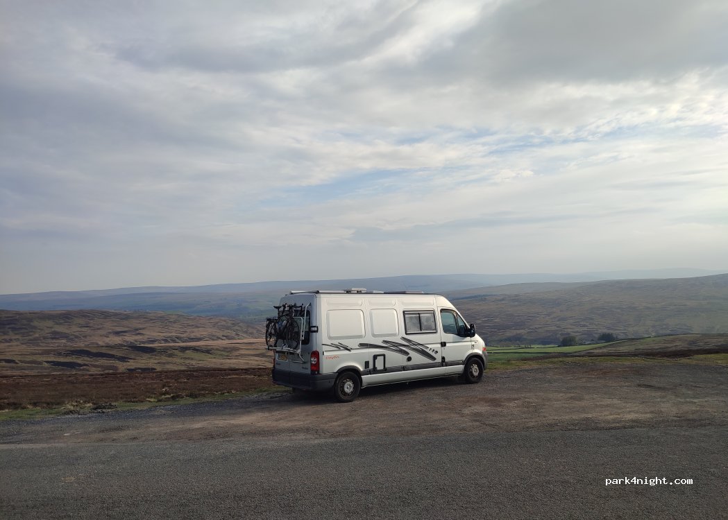 Hard standing parking area by the Blanchland to Stanhope road, about a mile north of B6278 junction. In the middle of the moors, fine views and very quiet. Exposed position so probably not good in high winds.