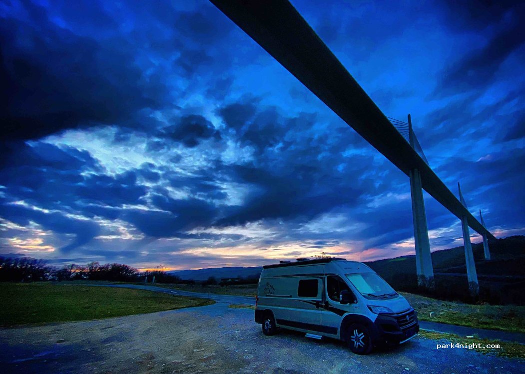 Stunning view of the viaduct approaching along the D992 from Sainte-Rome-de-Cernon. Free gravel parking with occasional cars stopping to admire the fantastic view we had all night. Engineering that makes you gasp in amazement.