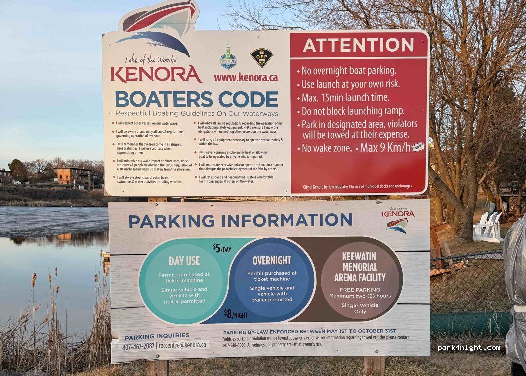 Offizieller Parkplatz der Stadt Kenora. Parken ist gebührenpflichtig. Maximal vier Tage. Geöffnet vom 1. Mai bis 31. Oktober. Die Gebühren werden am Parkautomaten oder für Kanadier per App bezahlt.