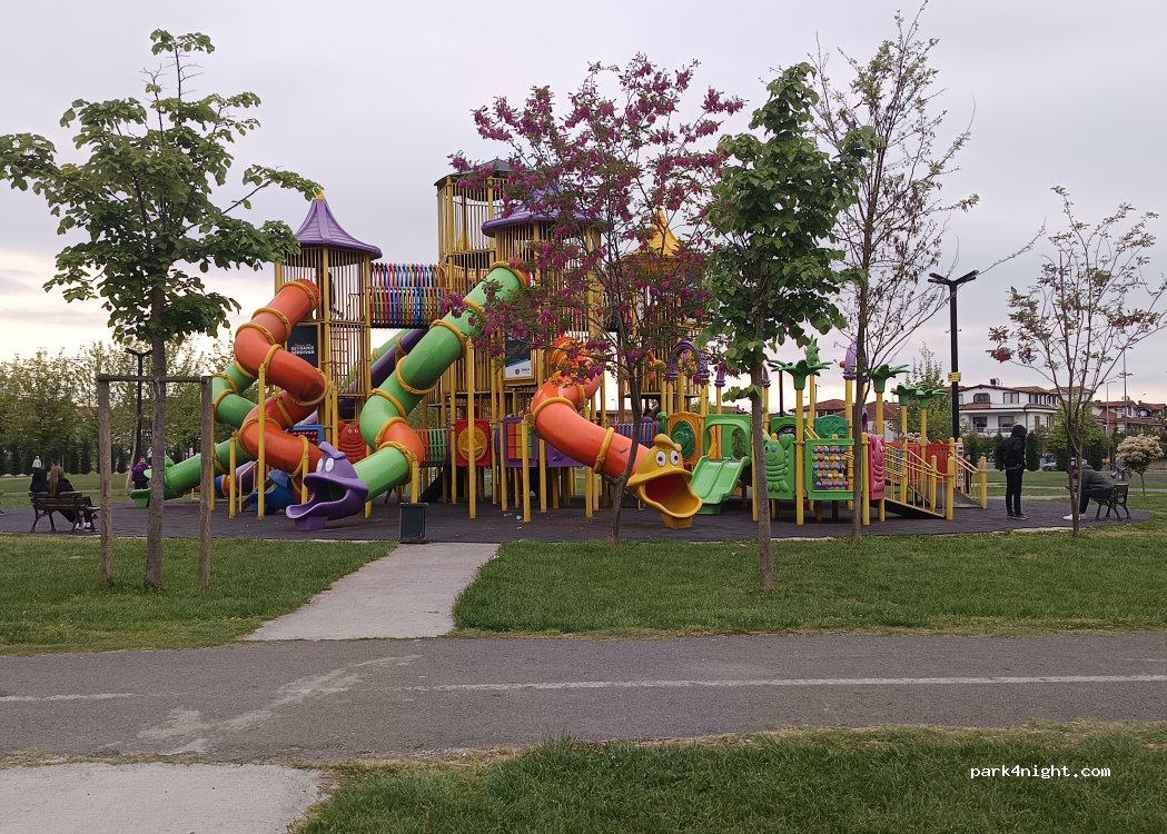 Parking in front of a huge children's paradise playground and a very large park.