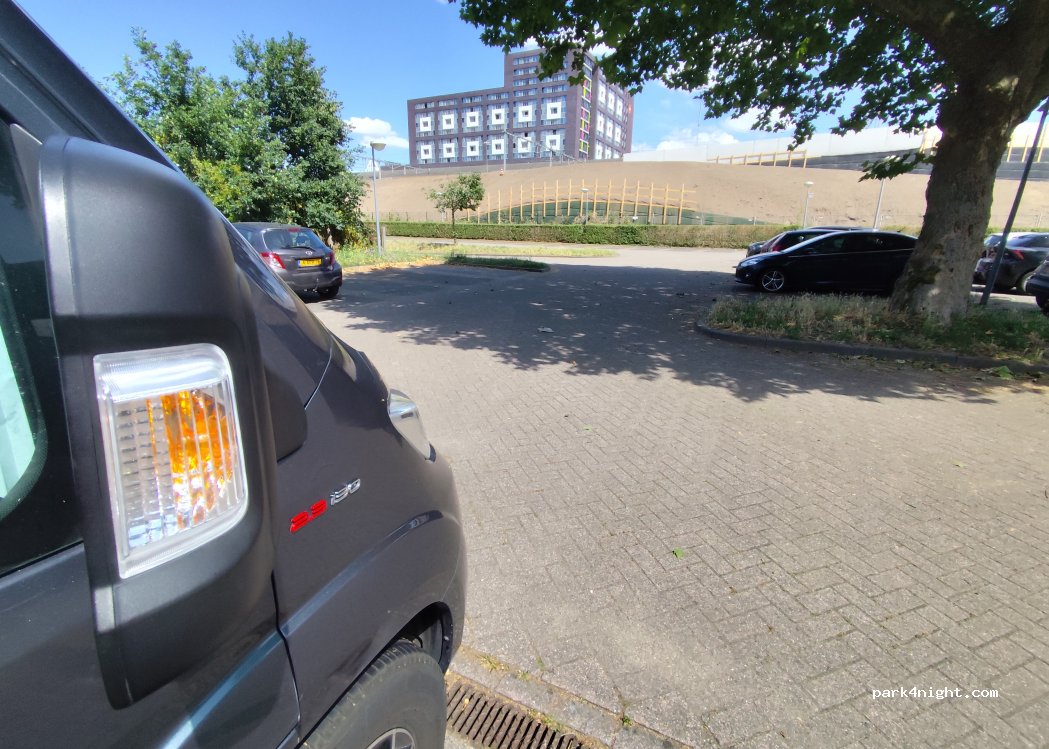 Large P+R parking related to the station of Nijmegen. The entrance is a bit narrow so large campers may have some trouble to drive in and out. The parking was almost empty when we were there, on a sunny Saturday in a long weekend in May. 15min walk to the center.