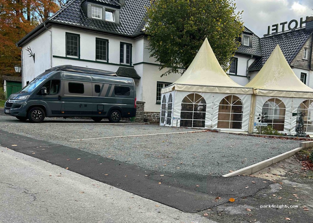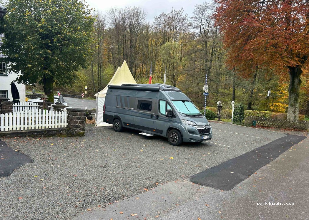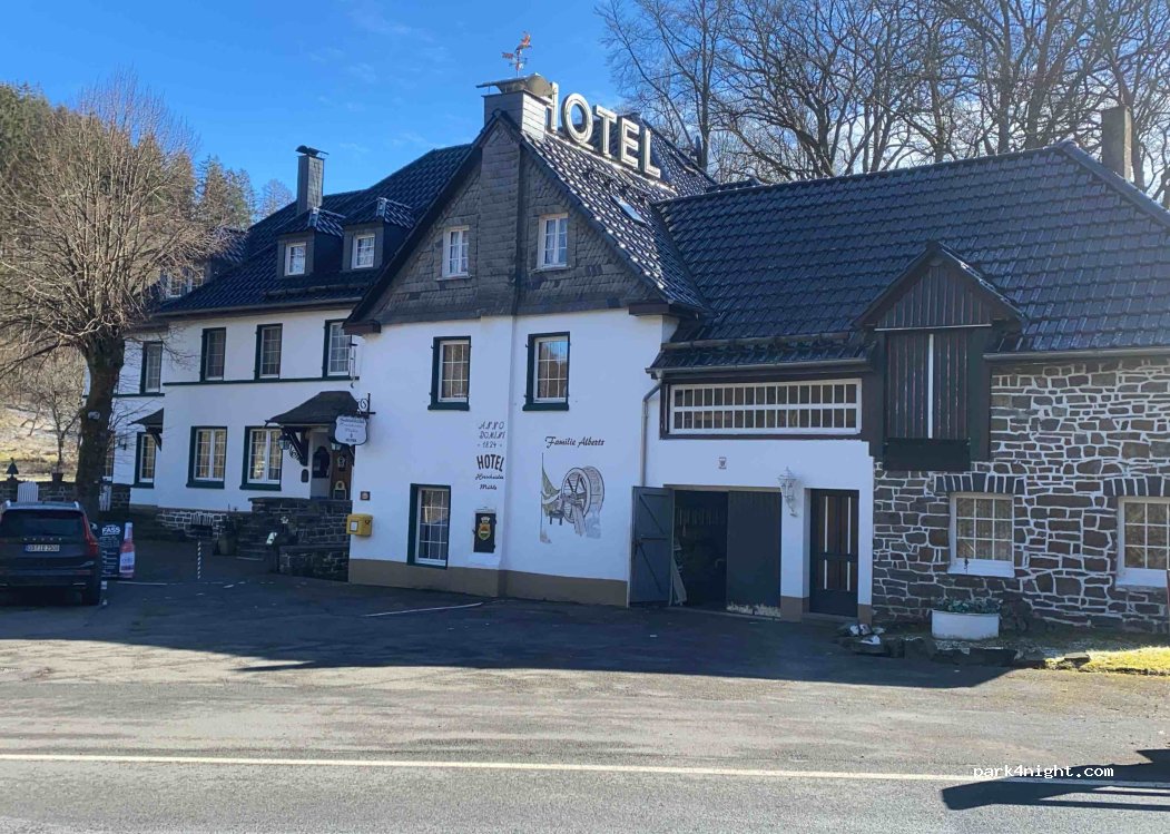 There are several RV parking spaces directly at the Herscheider Mühle Inn. It's nestled in the forest of the beautiful Sauerland region near Lüdenscheid. It's just 5 km from the A45 Lüdenscheid Süd exit toward Plettenberg. The hosts are helpful and friendly. Electricity and water are provided. We enjoyed a delicious home-style meal there in the evening and a delicious breakfast in the morning. We'd love to come back.