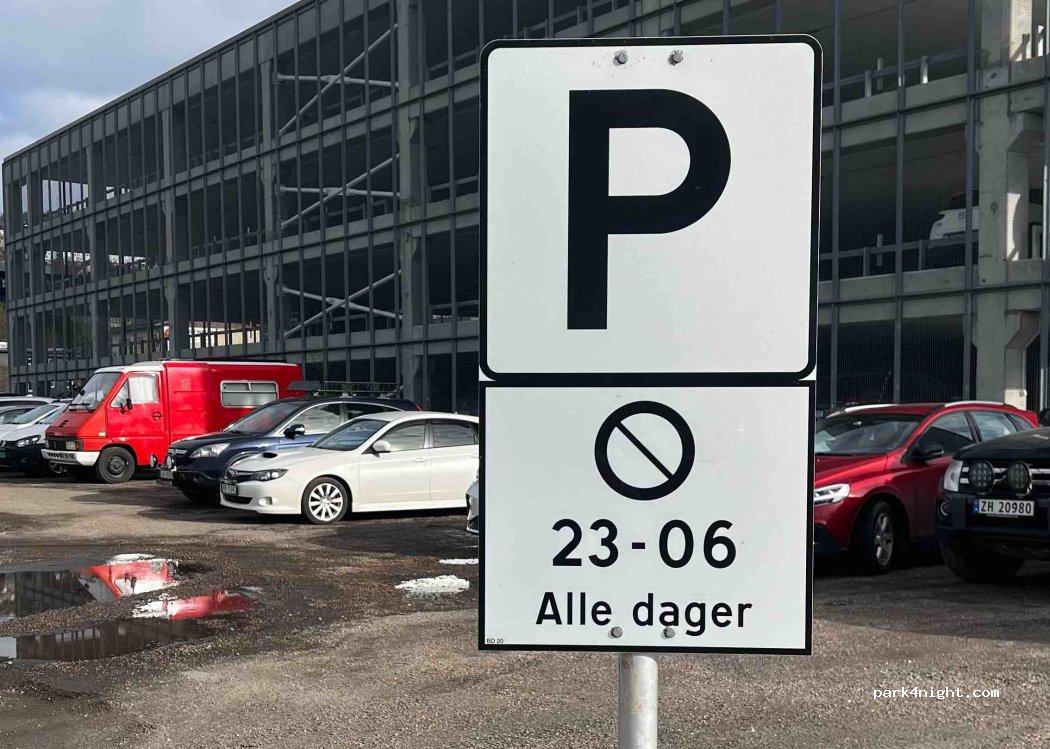 Un amplio aparcamiento plano de grava en las afueras del centro de la ciudad. Gratuito durante el día, pero prohibido estacionar durante la noche entre las 23:00 y las 6:00 (señal de prohibición).