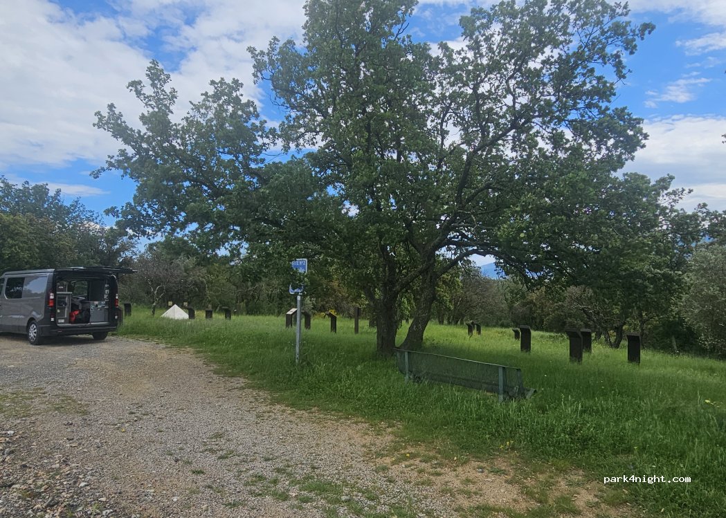Historischer Ort. Schöner Parkplatz, zeitweise ruhig. Es fahren auch nachts noch Autos ziemlich schnell vorbei, ansonsten super. Waren eine Nacht hier.