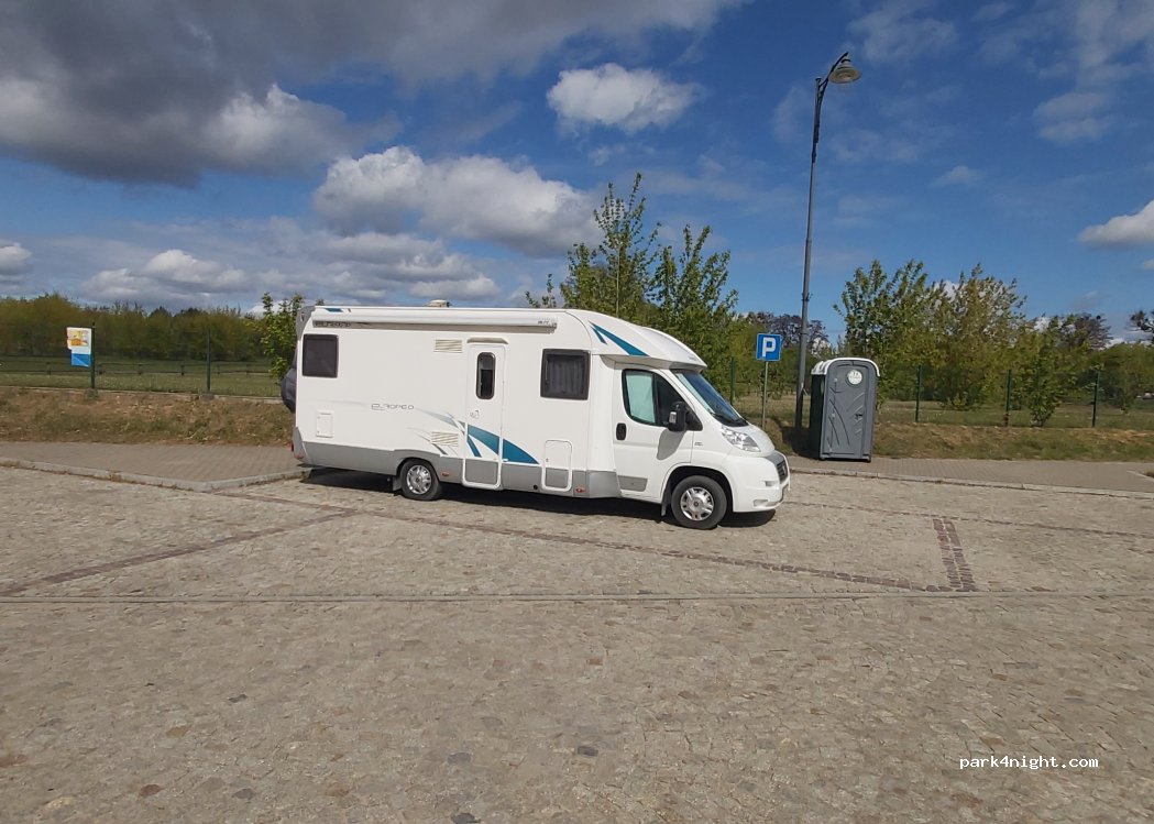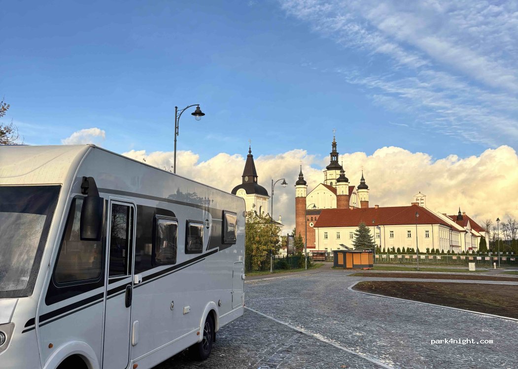 Großer Parkplatz am Kreisverkehr gegenüber dem Kloster. Hier können PKW, Wohnmobile, Busse und LKW parken. Es gibt auch eine Toilette.