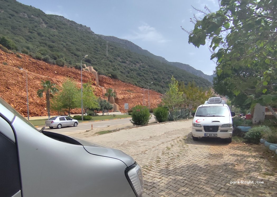 Nous nous sommes repliés ici en urgence à cause d’une grosse fête sur le parking de la plage de Kas, situé non loin.