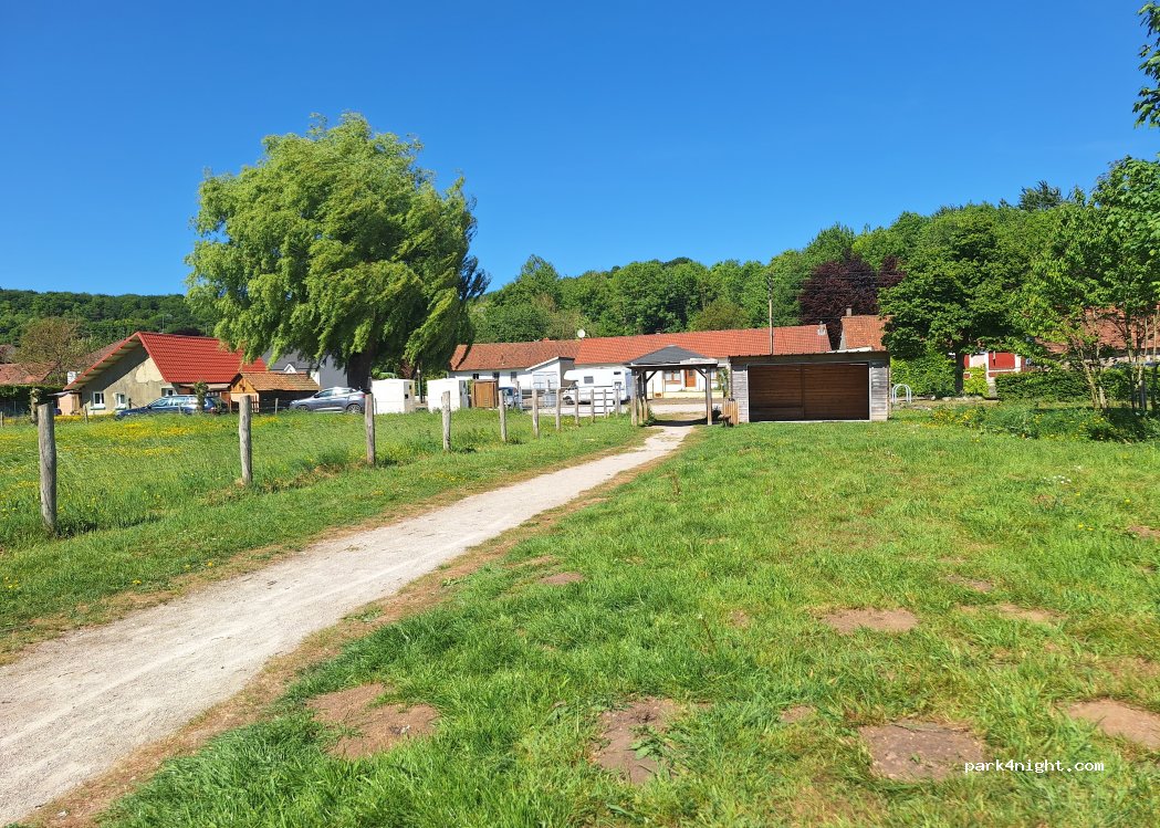 Parking accès au marais avec zone couverte table et banc, et poubelle selective