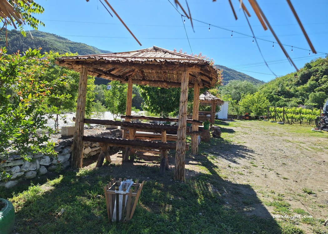 Prachtig plekje in een wijngaard aan de rivier van een super vriendelijk gezin. Een bijzondere ervaring was de heerlijke maaltijd die we geserveerd kregen onder de palmbladeren parasols. De wijn uit eigen wijngaard was eveneens erg lekker. Wel wat aan de prijs voor Albanese begrippen maar wij hebben er van genoten.