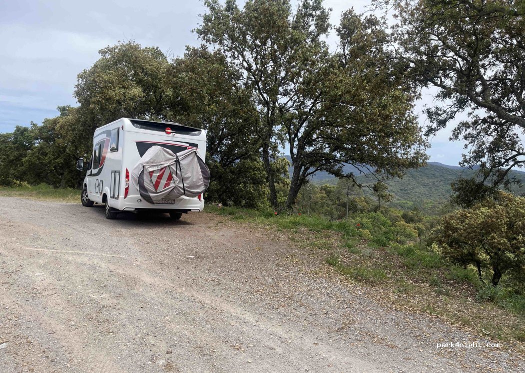 Grand carré presque plat ; belle vue sur la ville, la mer et la nature; idéal pour une pause - ou même pour une nuit ; sur le bord de la route avec peu de circulation