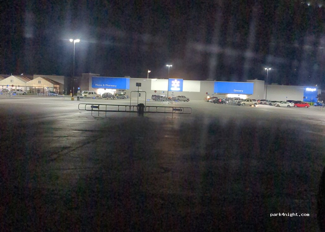 Auf dem Walmart-Parkplatz können Reisende übernachten. Toiletten und Essen und Getränke sind während der Geschäftszeiten erhältlich. Dunkler Hinterparkplatz, etwas Verkehrslärm, da es sich um eine Stadt handelt. Einige Schatten spendende Bäume rund um den äußeren Parkplatz.