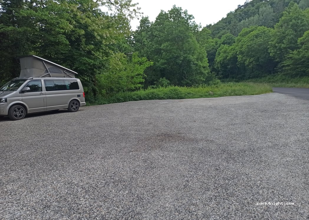 Gravel parking lot, large enough for several vehicles. Located on the roadside.