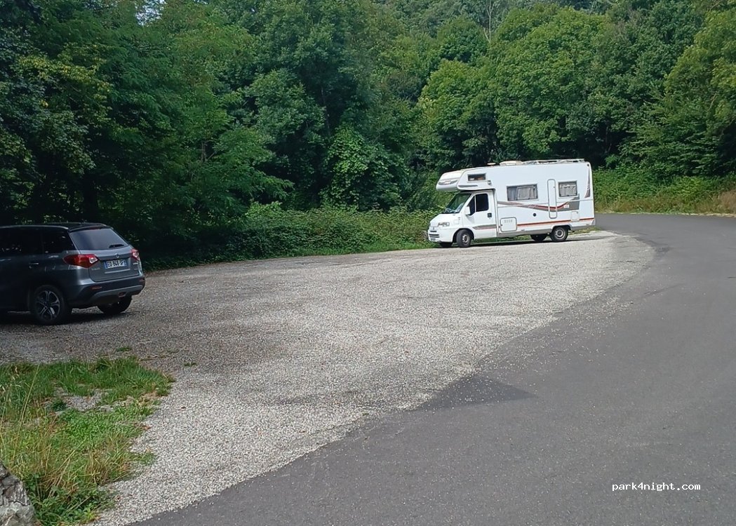 Parking gravillonné, assez grand pour plusieurs véhicules. Au bord de la route.