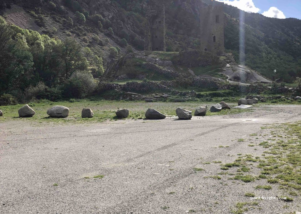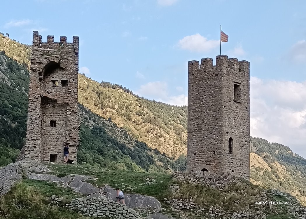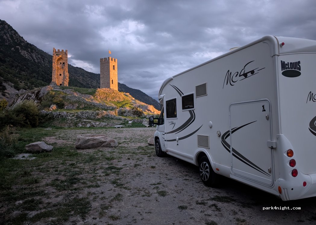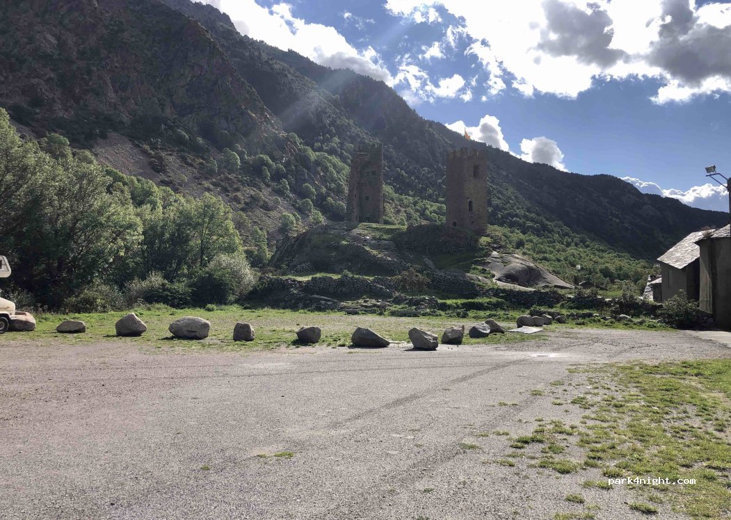 Parking at the bottom of the ruins of the Chateau de Querol, just after the village of Latour-de-Carol. The ruins are lit, it's very pretty. There's a small river below. It's peaceful. Glass, cardboard, etc. trash cans are not allowed. No prohibition signs.
