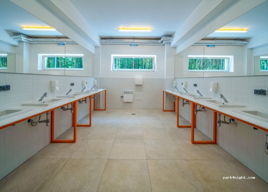 Clean and new facilities. Shower 5mins per person included in the price. Modern service station. Campsite in the shade, plenty of room. The only downside is the size of the pool ( too small for the amount of hotel and campsite guests) and building site next door (6am to 9pm) but hopefully this will end soon. We paid for a camper+2 adults+12yo and 10yo 140zl. Recommend.