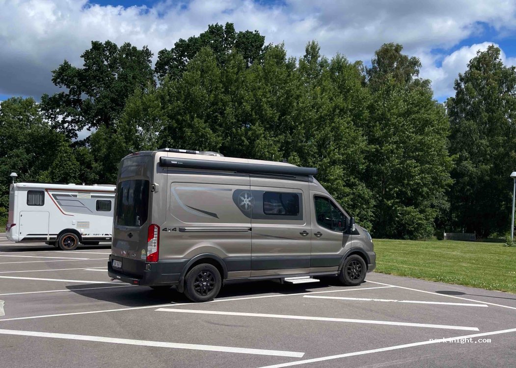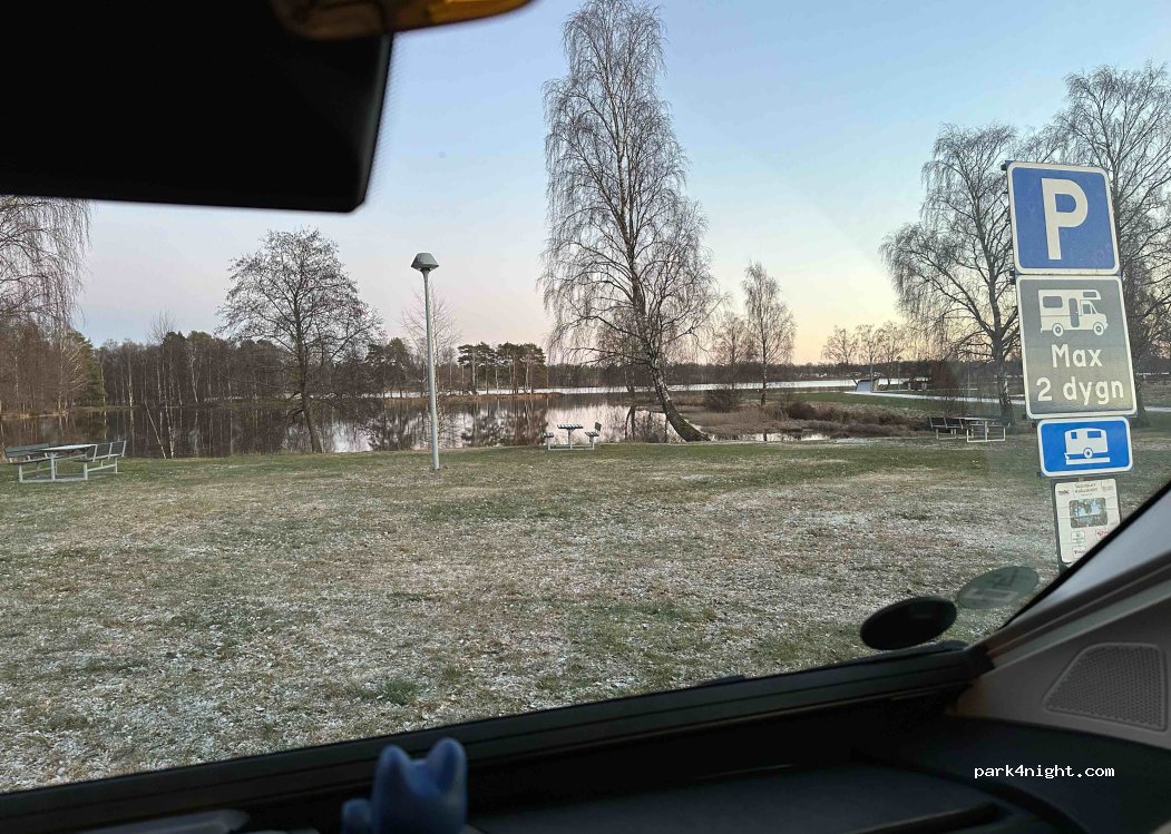 Nice parking lot, free with 6 places for big vehicles and more than enough places for smaller (~6m), next to a lake & a street, with some benches & tables /BBQ place. Bathrooms, drinking water (not for tank refill), toilet disposal very convienet and good to use. recommended for toilet tank cleaning ;) good for one night or over day Picknick official max stay 2 days