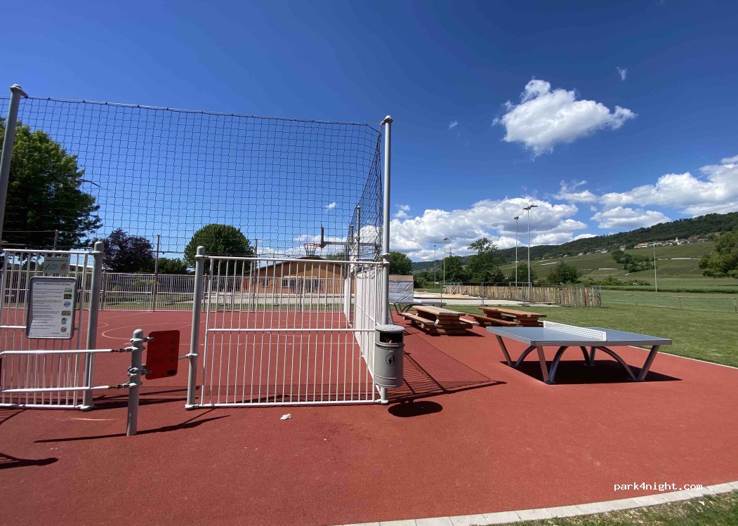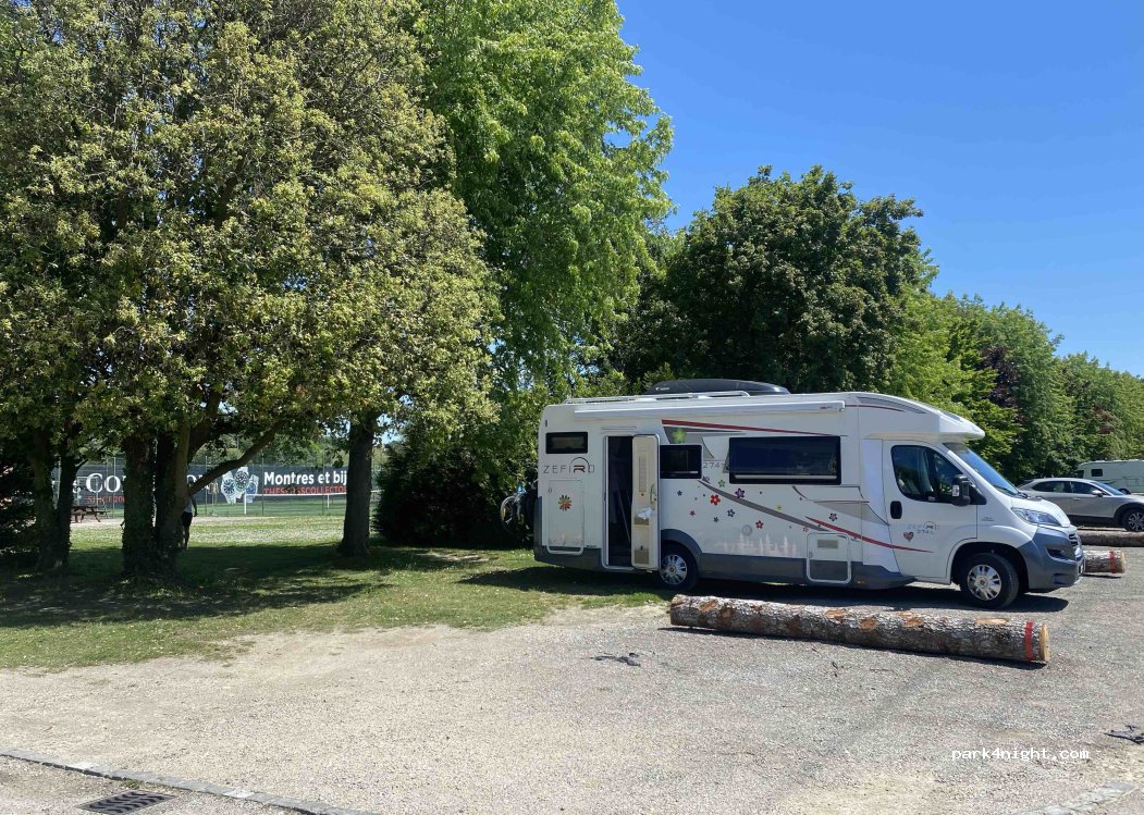 Aire sympa pour toutes tailles de bus et camping car. Pas de limite en temps indiquée. Place de jeu. Défaut face à la ligne tgv
