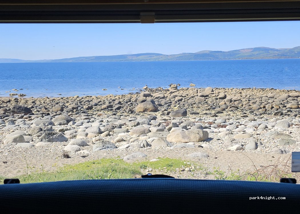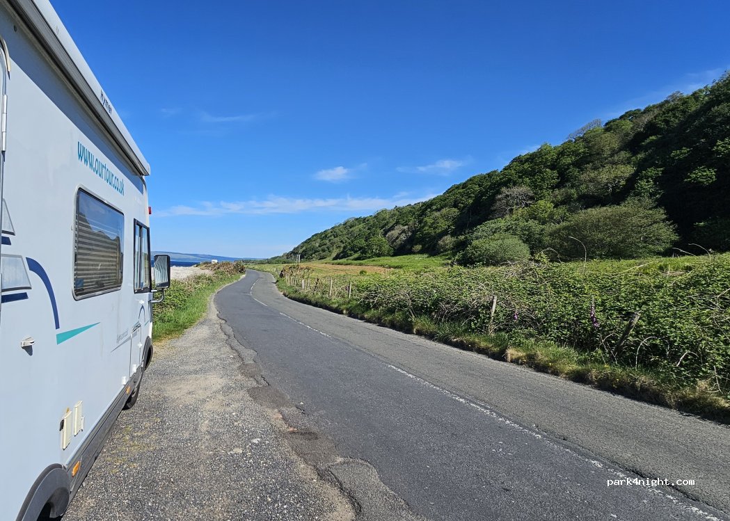 One of many roadside parking spots on the west coast of Arran. Space for one van, sloping a little. Direct access to stony beach. Road pretty quiet. Idyllic spot with seal watching from your van. Be aware of barrel jellyfish if swimming (they sting). Nothing else here, come empty/full. The other p4n spot nearby is large enough for 2 vans. There are vans dotted along the coast here at the moment but still plenty of options.