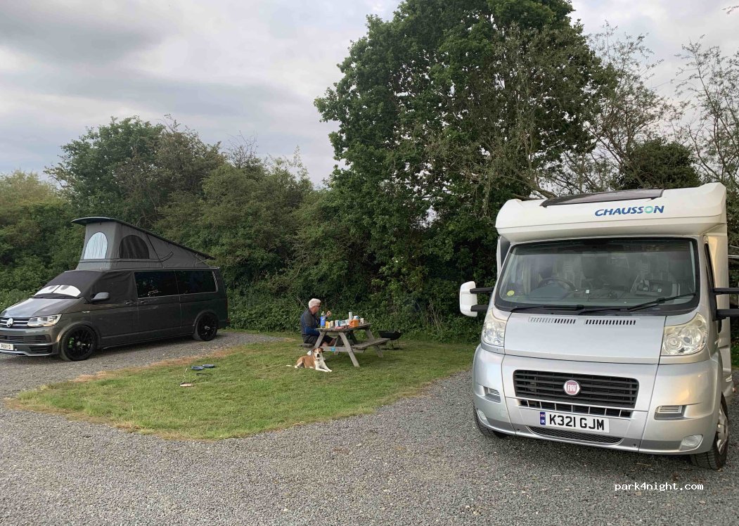 Between two rivers campsite. 6 motorhome places good size. No electricity. Fab night came for 1 staying for 3 lovely showers nice hot water. Food was yummy in the pub. Really quiet, relaxing and spotlessly clean.