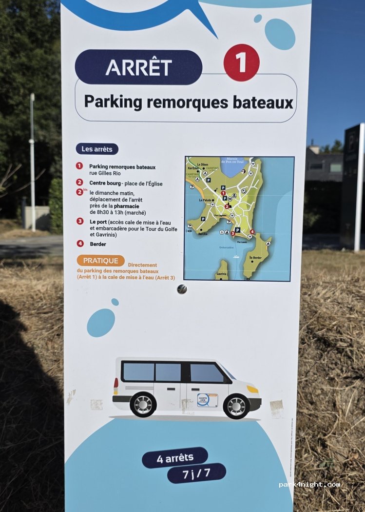 Parking gratuit pour camping-cars. Le site est balisé dans le village et se situe juste à côté d'un grand parking. Idéal comme base pour des balades en bateau dans le Golfe du Morbihan et des randonnées le long du littoral.
