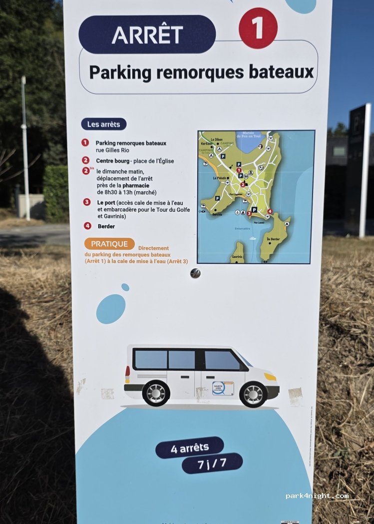 Free parking for motorhomes. The site is signposted in the village and is located right next to a large parking lot. It's an ideal base for boat trips in the Gulf of Morbihan and hikes along the coast.