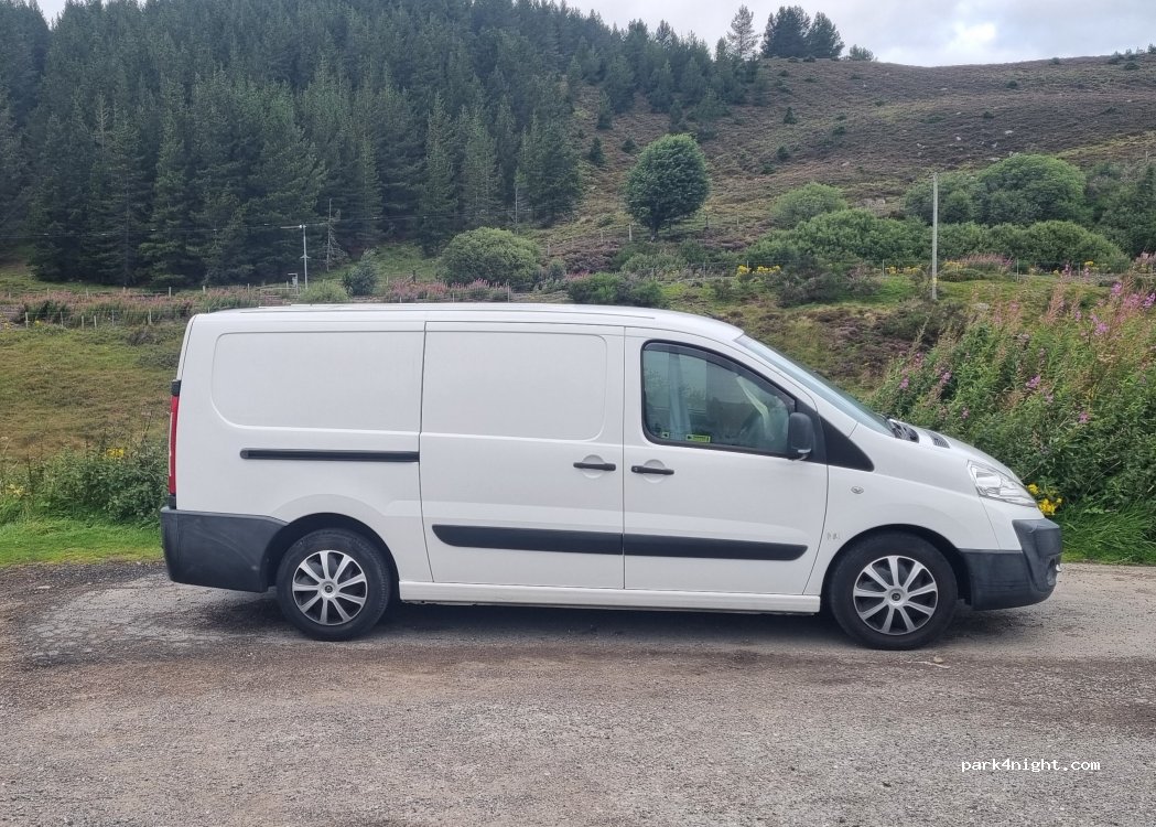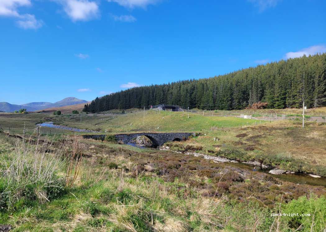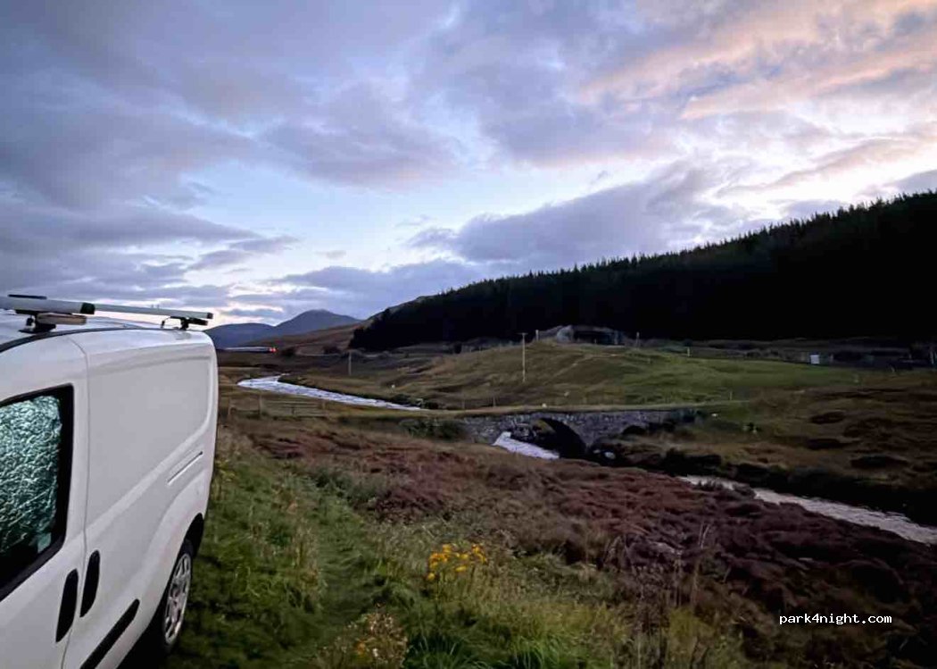 Layby where A889 meets A9 and on the cycle trail. Bridge on River Truim. We used for breakfast & walking the dogs. Can hear A9 so not sure how it would be overnight. Easy little spot to pull in on your travels.