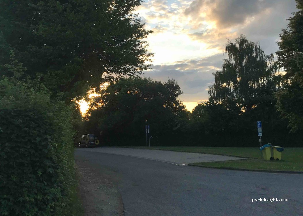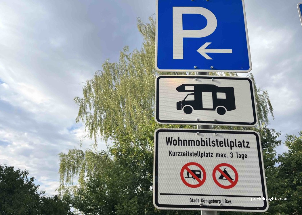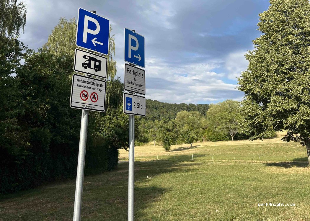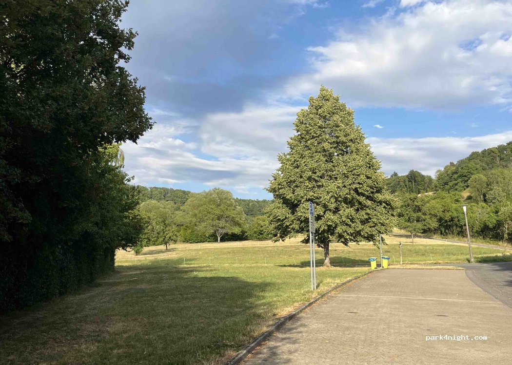 Small parking lot next to a cemetery. Quiet, maybe sporting events are held there. A short walk into the truly beautiful town with half-timbered houses with loving details. Permitted for 3 days. Trash cans are available, but please keep them clean. If you park parallel, you have a small patch of grass to use as a "terrace."