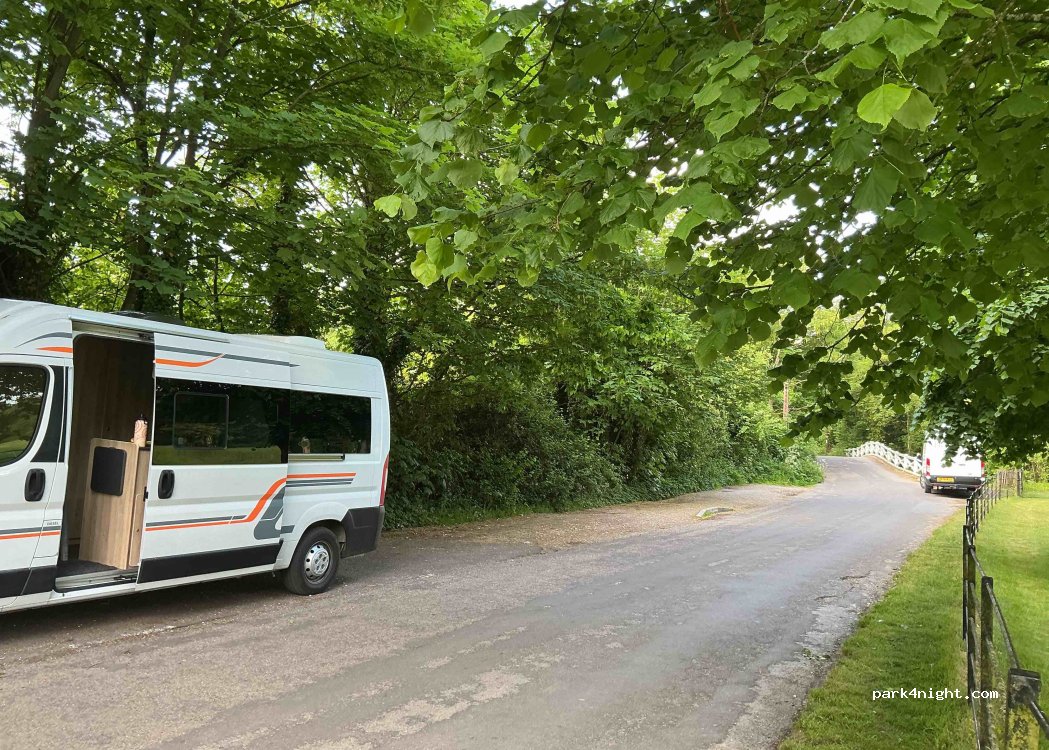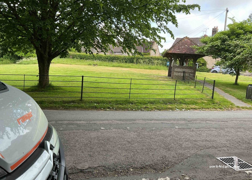 Roadside parking in side street opposite a park with picnic tables. Quiet night. Possible alternative parking at nearby village hall near a creek where there are no obvious signs to prohibit parking.