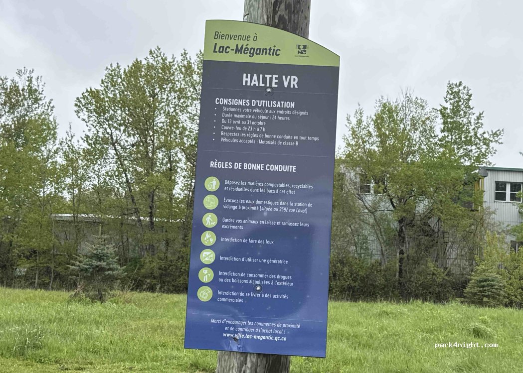 Stationnement jour/nuit situé à l’arrière du centre sportif Lac Mégantic site autorisé avec affichage pour VR classe B site tranquille, parc à chien à proximité adjacent au centre sportif, accès par le stationnement à l’arrière. Piscine publique. Douche 5$