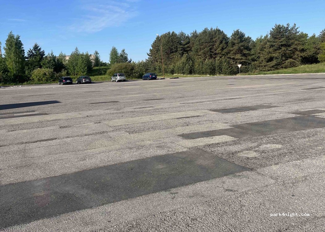 Amplio aparcamiento junto a la autopista y junto a la gasolinera. Sin coste ni restricciones de altura. No hay servicios aparte de los de la gasolinera y también hay baños portátiles cerca de los camiones.