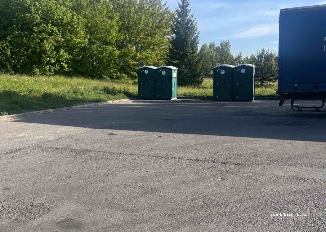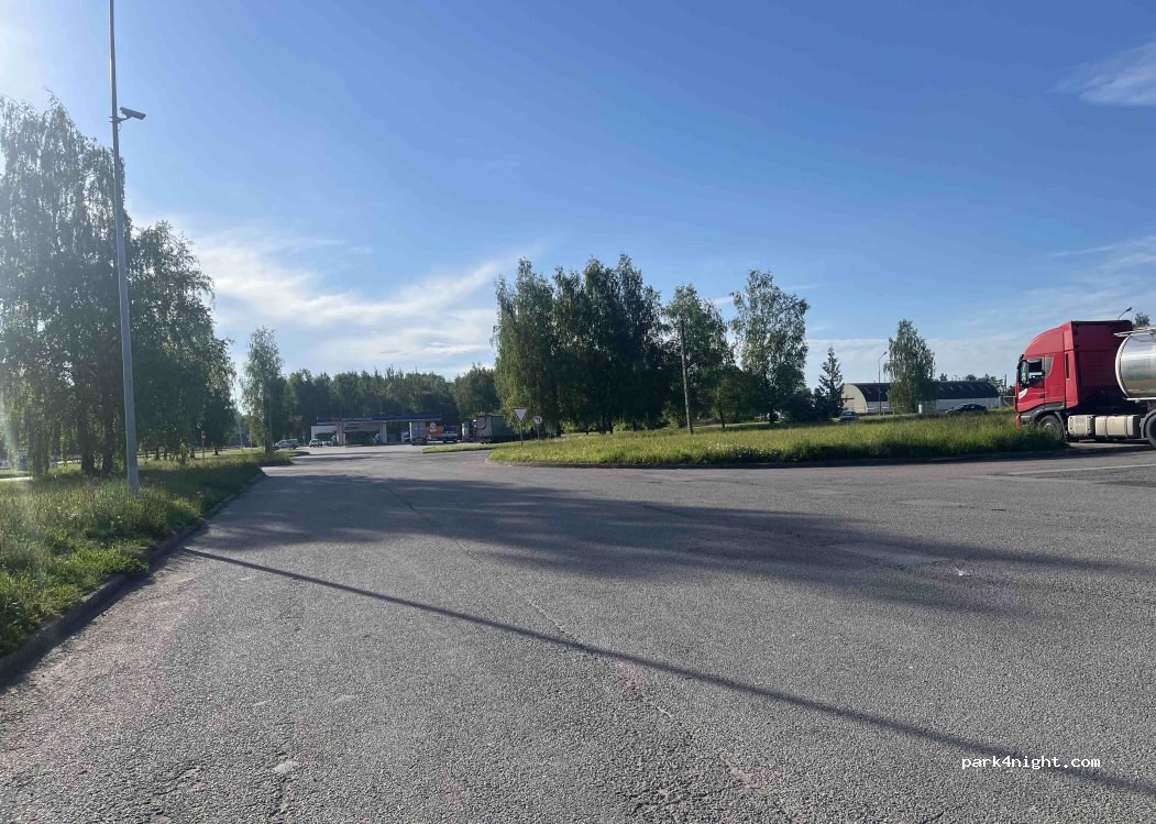 Très grand parking directement à la sortie de l'autoroute et à côté de la station-service. Stationnement gratuit et sans limite de taille. Aucun service autre que celui de la station-service. Toilettes portables à proximité des camions.