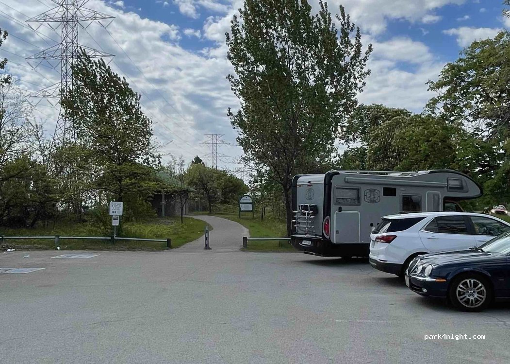 An area with a small parking lot, restrooms, and access to Lake Ontario. There's a tap for refilling small bottles, and another one behind the building with a good flow rate. There's a bike or rollerblading lane next to the lake. We only stopped to refill water; we didn't see a sign indicating no overnight stay, so we didn't know if it was possible. Let's take care of the environment and respect these spaces so we can continue to enjoy them.