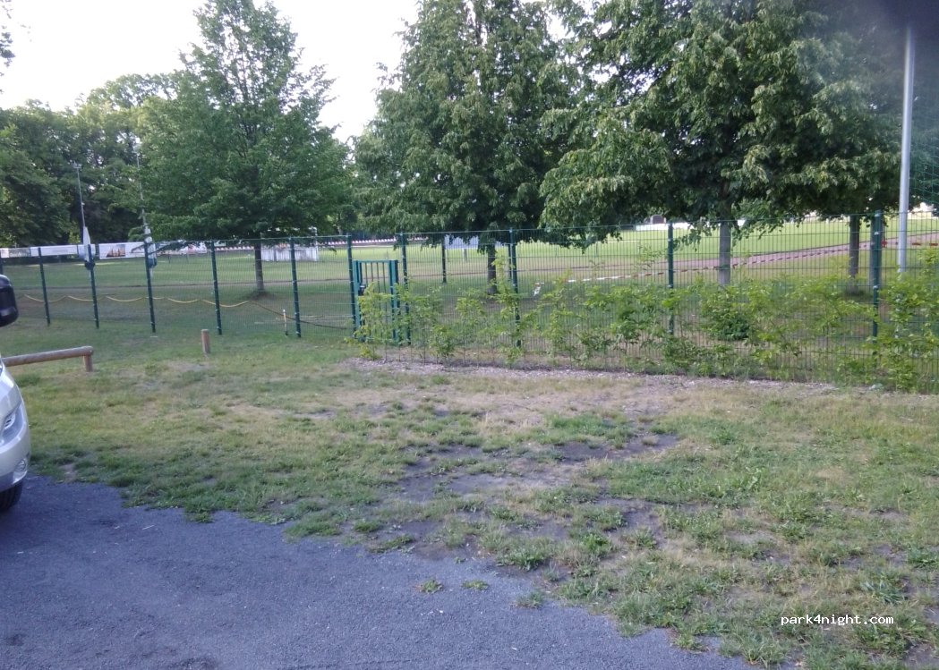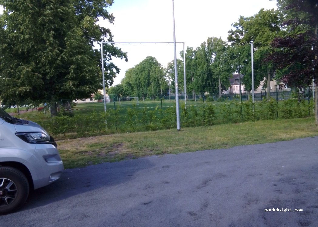 Haben hier eine ruhige Durchgangsnacht verbracht. Spielplatz mit Spiel- u. Fitnessgeräten, Basketballkorb und Bouleplatz direkt neben dem Parkplatz. War prima.