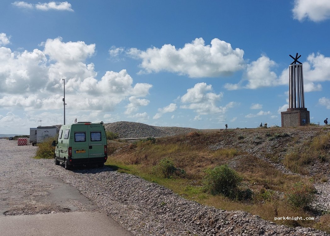 Parken nur am Rand eines Kiesweges. Keine Sicht aufs Meer. Aber Spazierweg auf dem Deich. Strand besteht aus großen Kieselsteinen. Schlecht zum laufen.