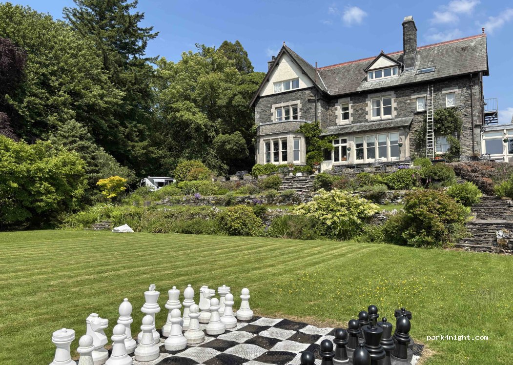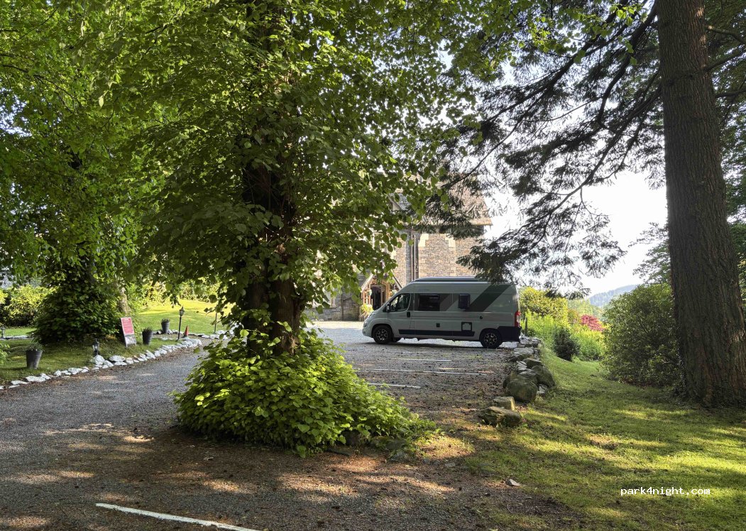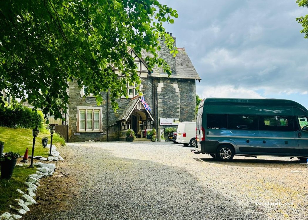 Voor de ingang van de authentieke Victoriaanse B&B is de parkeerplaats (op grind) waar een paar kleine campervans kunnen staan. De eigenaar David ontving ons vriendelijk. Op het terras met fraai uitzicht kunnen we iets drinken en eten. In een hotelkamer op de begane grond kunnen we zelfs douchen. Leuke sfeervolle overnachting in het hart van het Lake District.