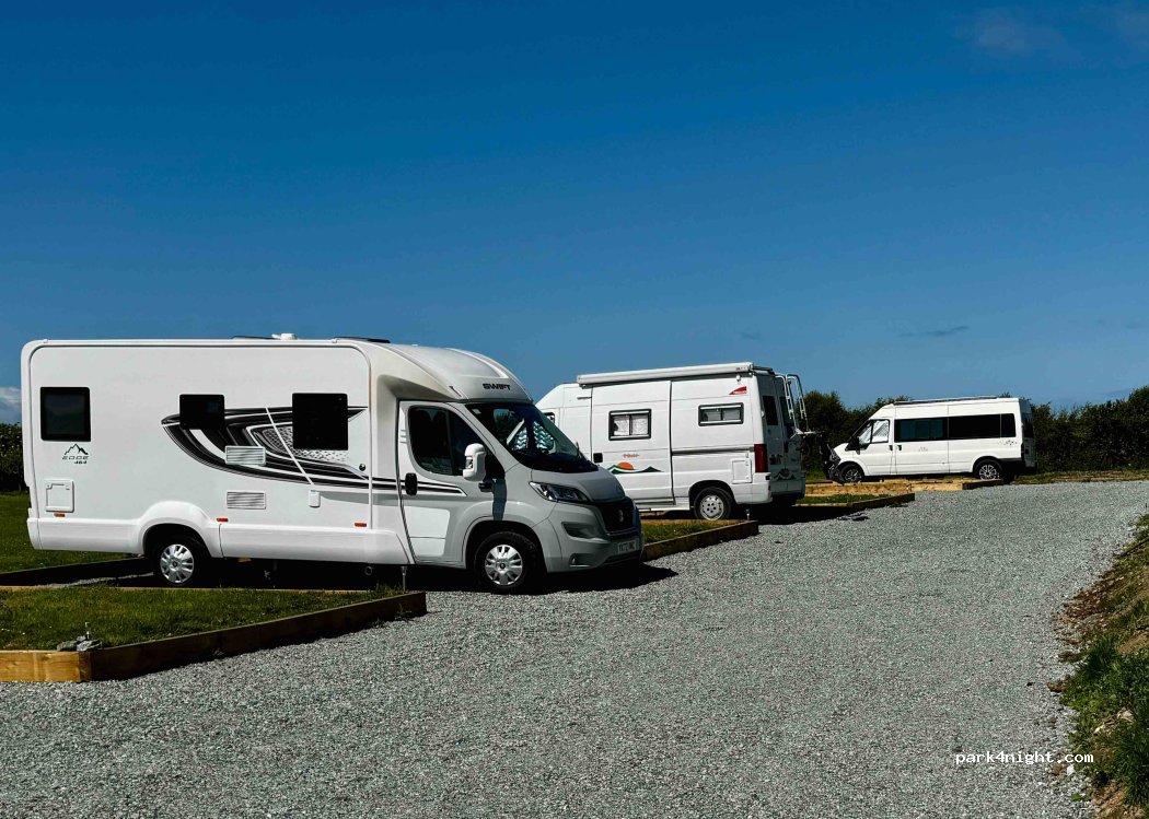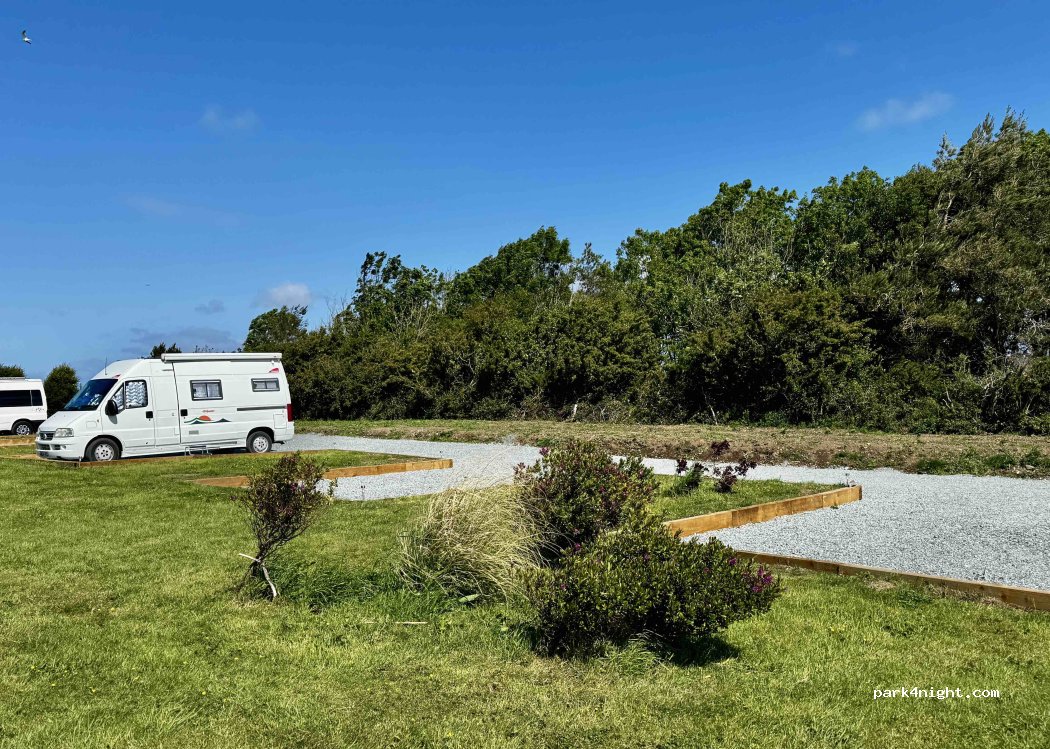 We spent just one night here b4 our ferry. Directions were really good from Jem. A very narrow track but we navigated it easily in our 7m van. A quiet site with level gravel bays. Didn't need to see anyone, all paid for online using Airestop.