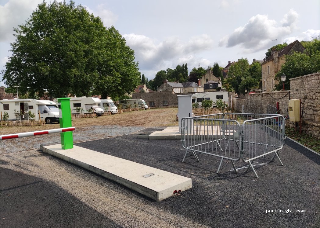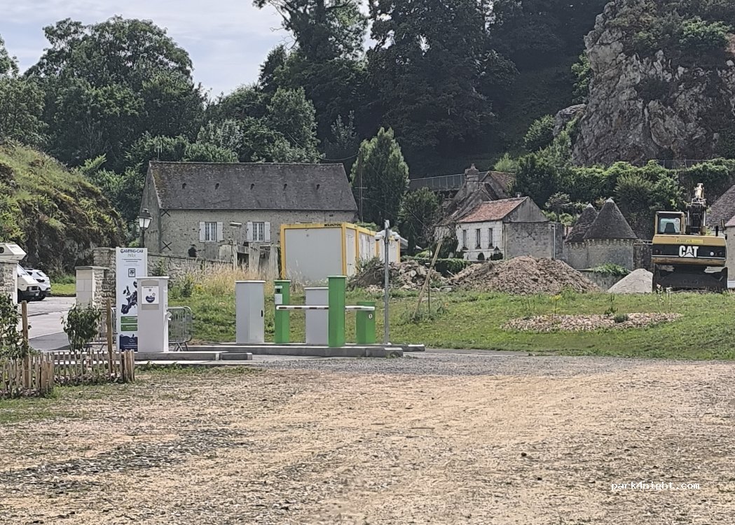 nous sommes arriver sur l aire cers 16h une catastrophe gadoue , troue , emplacement délimité mais aucun entretien , cette aire est ouverte mais pas finie a notre avis car juste a coter des vidange et ravitaillement en eau un coffret electrique est adosser au mur avec une prise en 380 et le cable passe par dessus le mur se systeme desservit les poste en 220