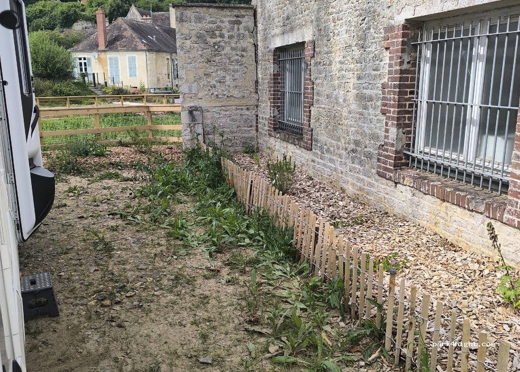 très bien au pied du château, un peu de boue lorsqu'il pleut mais aire nouvelle il faut que ça pousse emplacement stabilisé avec haies de pommier travaux en cours à côté dans la journée un peu bruyant je pense provisoires ! à voir dans le temps