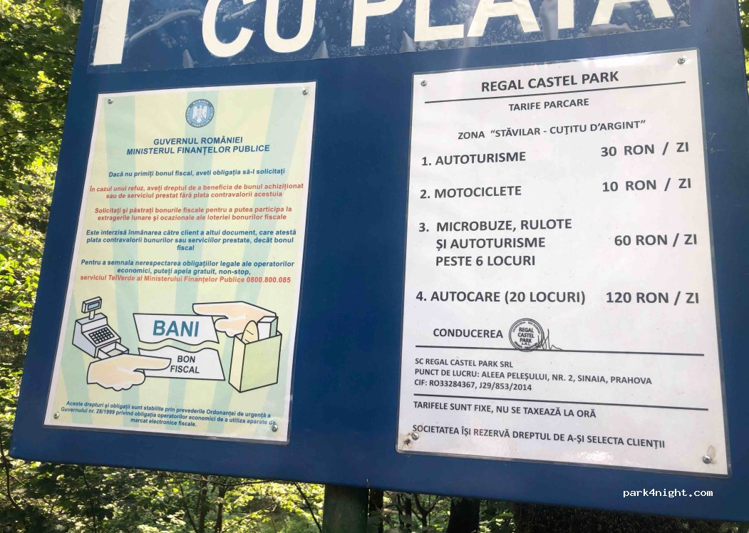 We slept over and took a visit to castle in the early morning. Parking place was completely full when we were back then. We paid 50 Lei for caravan / rulote when leaving. The street is little noisy - traffic to the hotels above parking place.