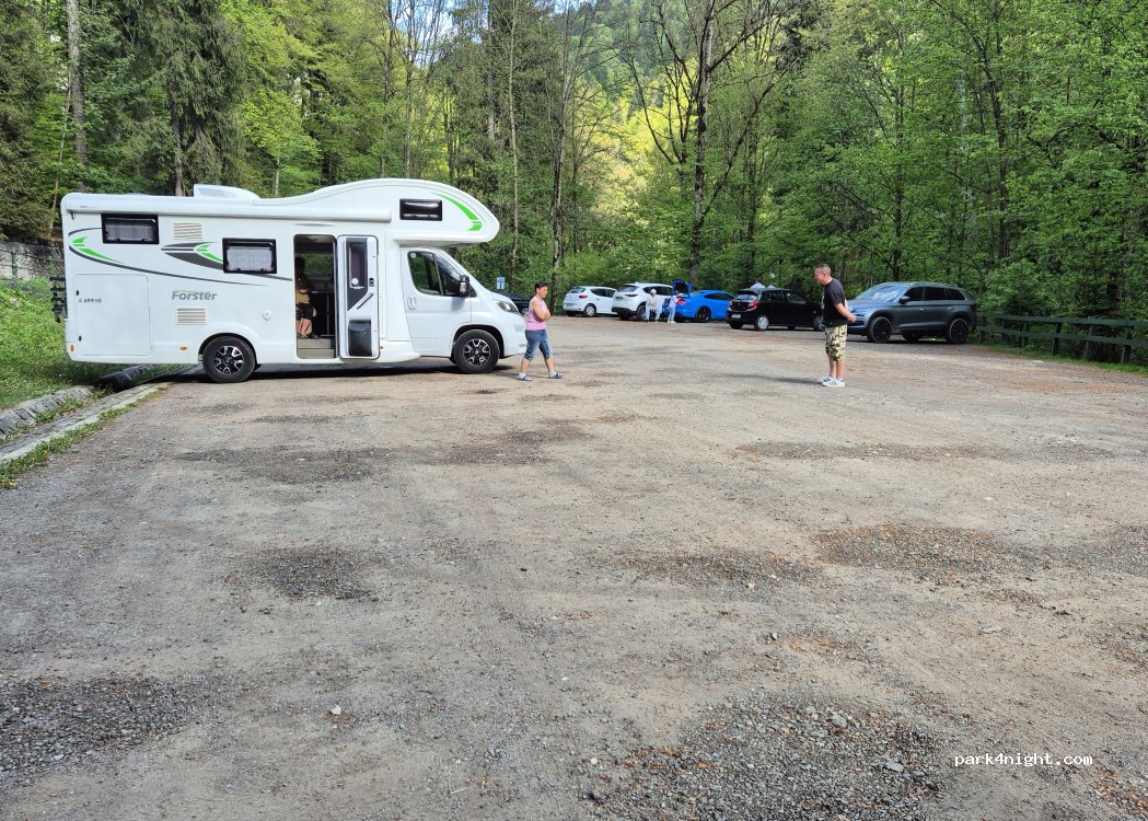 Excellent place for the night, we stayed in the lower car park as we are a large van(8.6)and there is a lot more room there. Very quiet. We saw a bear family with 2 cubs about 10pm right next to the van. Castle is definitely a must see but go early!