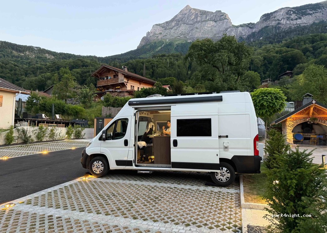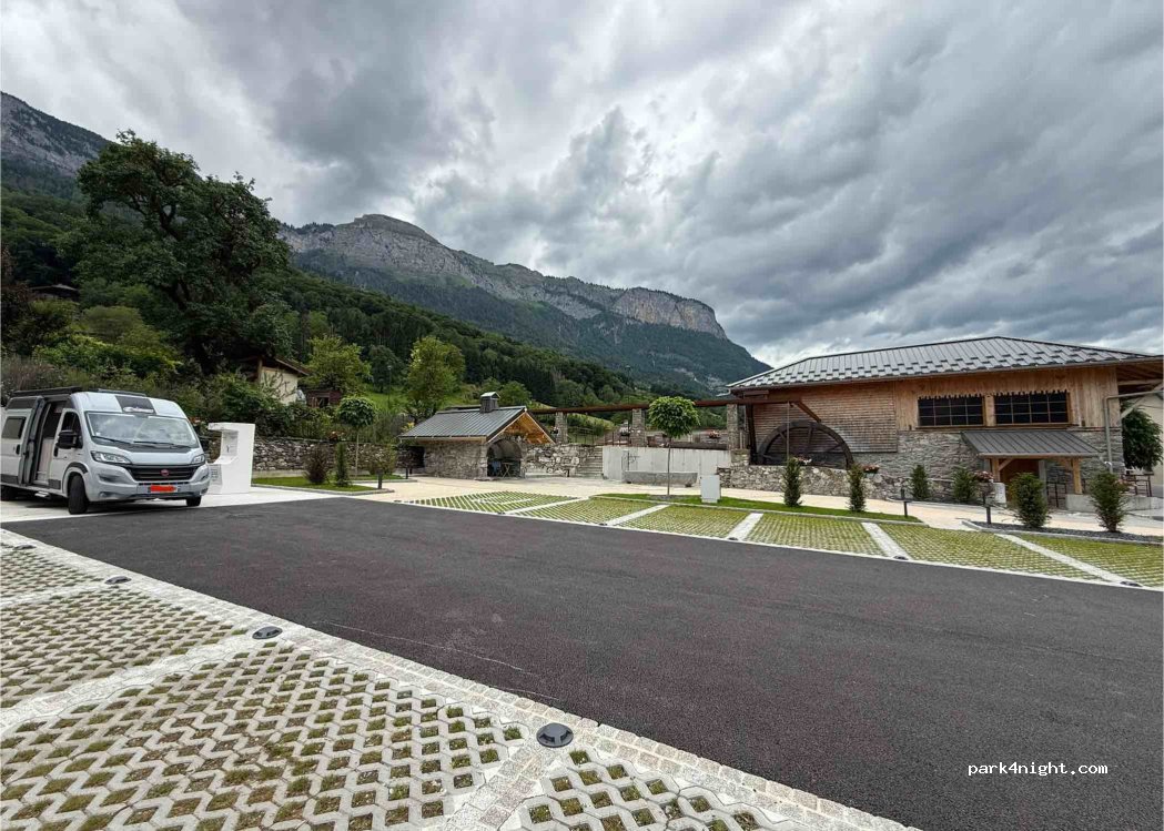 Wow! All praise to the people of Gravin/Magland. A beautiful, clean, brand new and free camperspot with a 5* view on the mountains. Hiking nearby (mainly GR), old renovated woodmill, source, very clean public toilet, chairs/table in charming little town. Skatepark for kids down the road. An awesome find. Thank you!