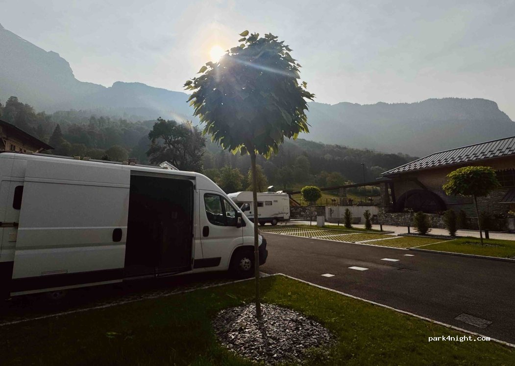 Excellent and clean stop. Mountain walks up behind. Our van is 6.1m, spaces are really too short for anything larger. Two longer vehicles were parked across the spaces but not a problem at this time of the year.