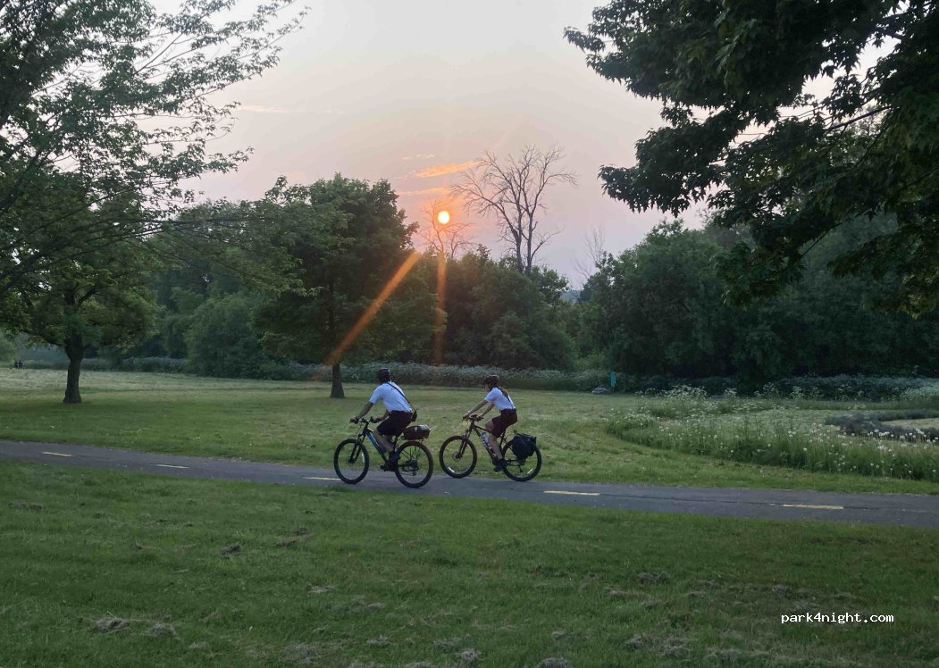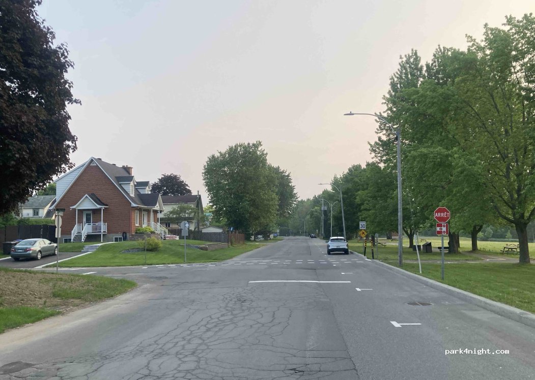 Pas clair si le pkg se fait en bordure de rue dans les espaces délimités par les lignes blanches. Sinon, si on va dans la zone du parc, il faut traverser une piste cyclable avec le VR, ce qui me semble non-sécuritaire pour les usagers de la piste cyclable. Je n’ai pas osé y stationner, j’ai alors opté pour le pkg derrière la salle municipale à 1 km de là.