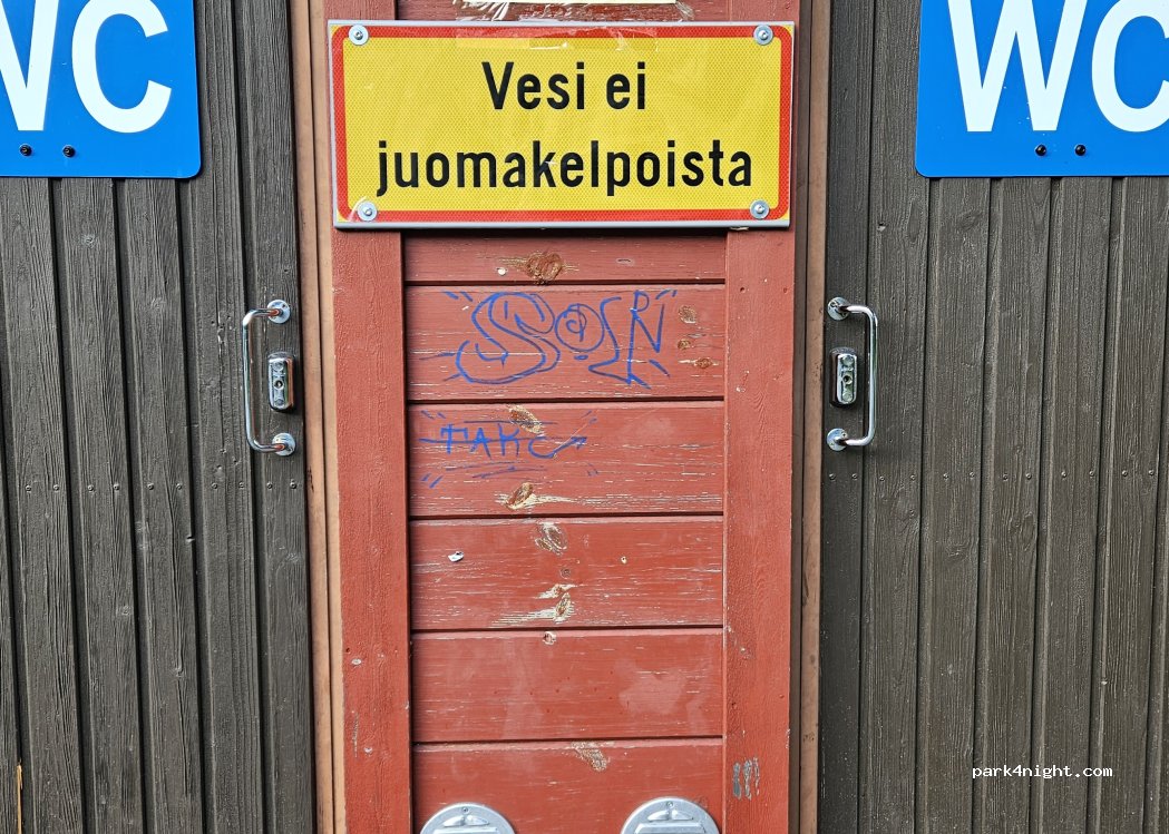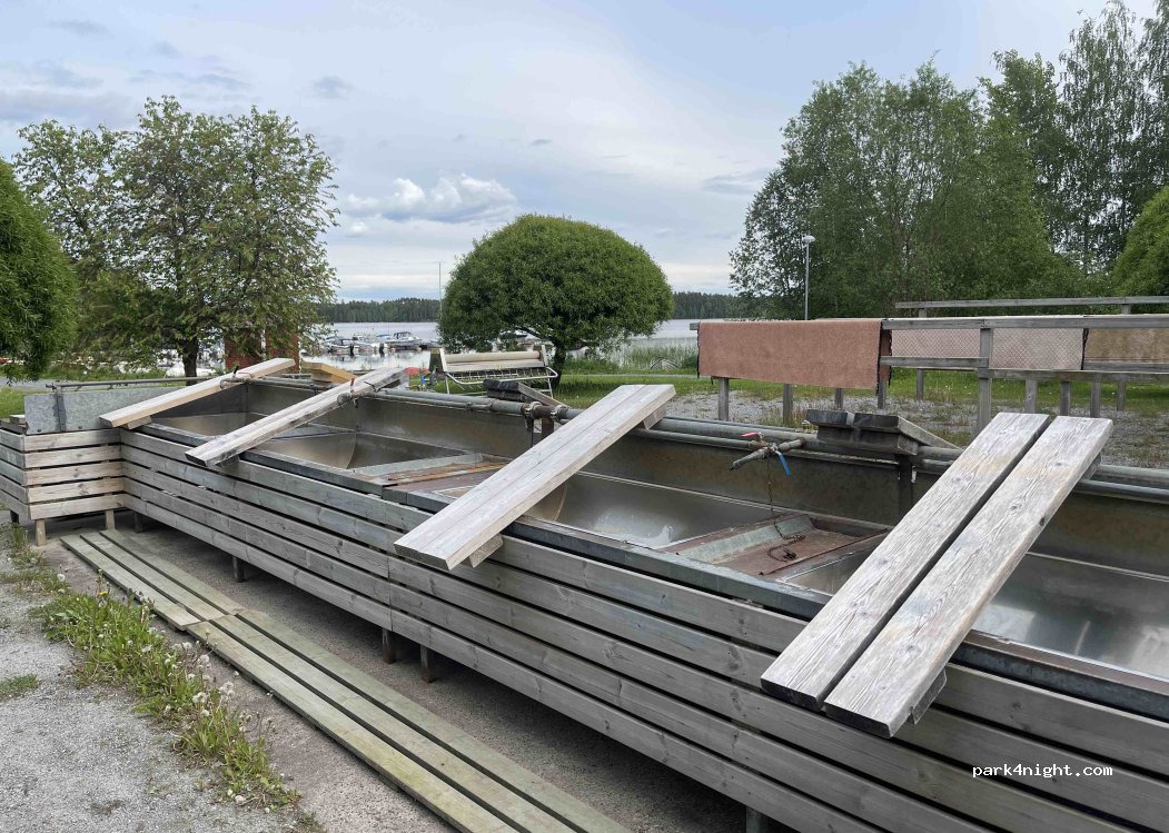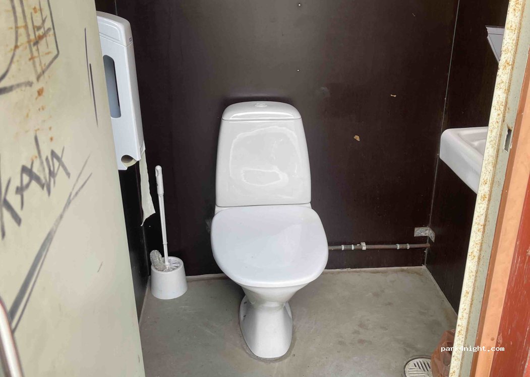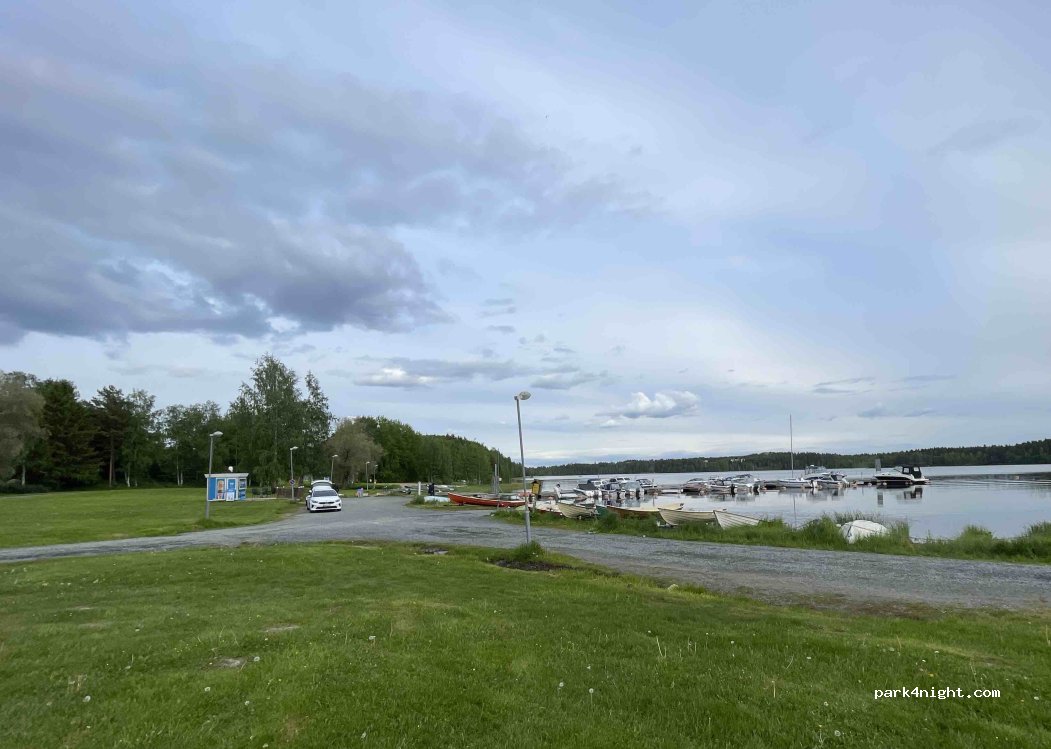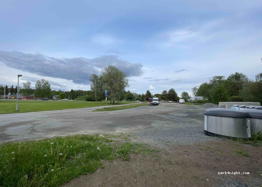 Nice free parking place to park for a day or more. There’s a big grassy park next to it with a playground. Carpet washing station as well as toilettes right next to parking place(No drinking water). There’s a public sand beach and a small boar marine with a icecream shop during the summer months. Recycling station for cardboard, paper, metal and glass as well as a mixed trash bin.