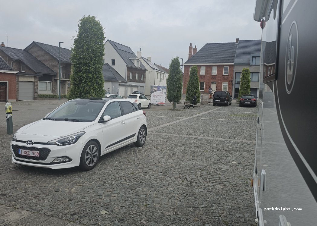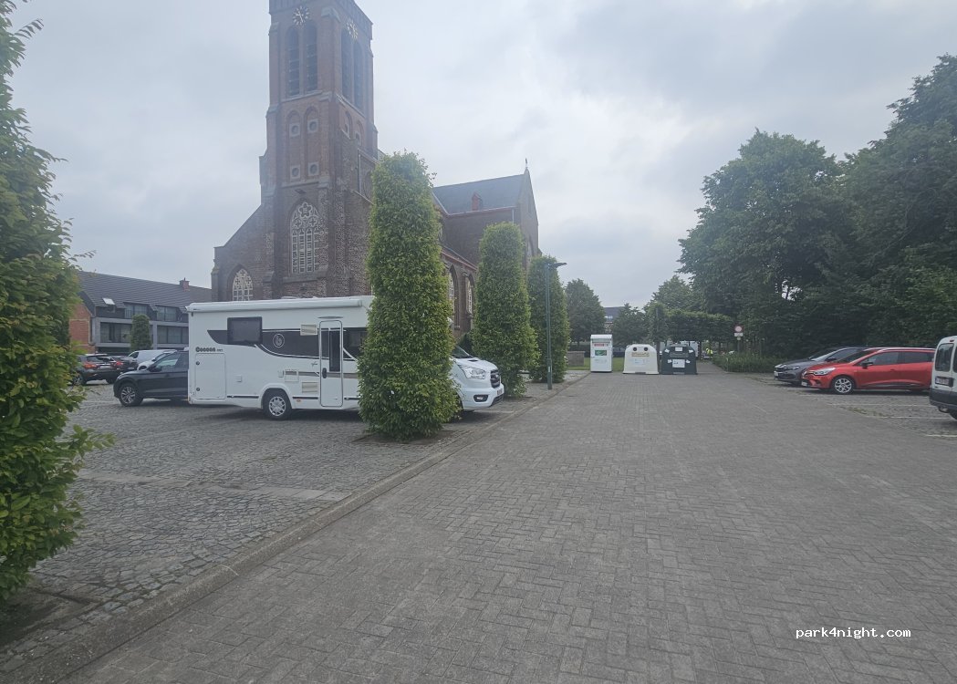 Parking at the church with a few places that are big enough for a camper. It is located in a quiet village, right next to the cemetery. There are several garbage bins, a glass container and a small park. There are also charging stations for electric cars. At the church so there are bells and there can be a funeral or wedding party or something.