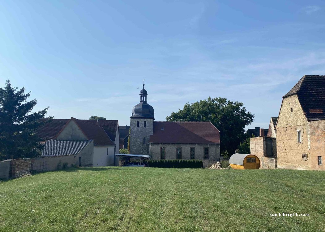 Die Wiese ist knapp 2000qm groß und es grenzen direkt weitläufige Feldwege an, die zu entspannten Spaziergängen oder Radtouren bspw. zur Quelle der Geisel einladen. An der anderen Seite der Wiese liegt die Dorfkirche mit den berühmten Deckengemälden des Künstlers Karl Völker - Führungen sind natürlich möglich!
