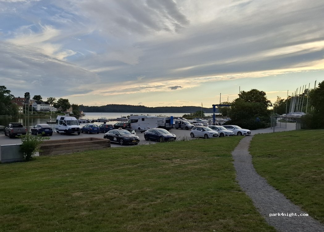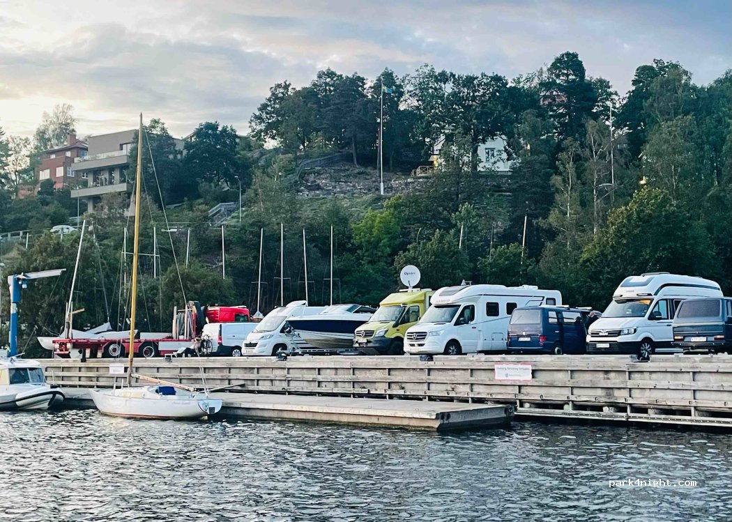 You can stay up to 24 hour (public parking rule in Stockholm) here with nice view over the water and a petrol station next to it with toilet that is always open and can be used. Best spot so far near Stockholm. Park nearby too.
