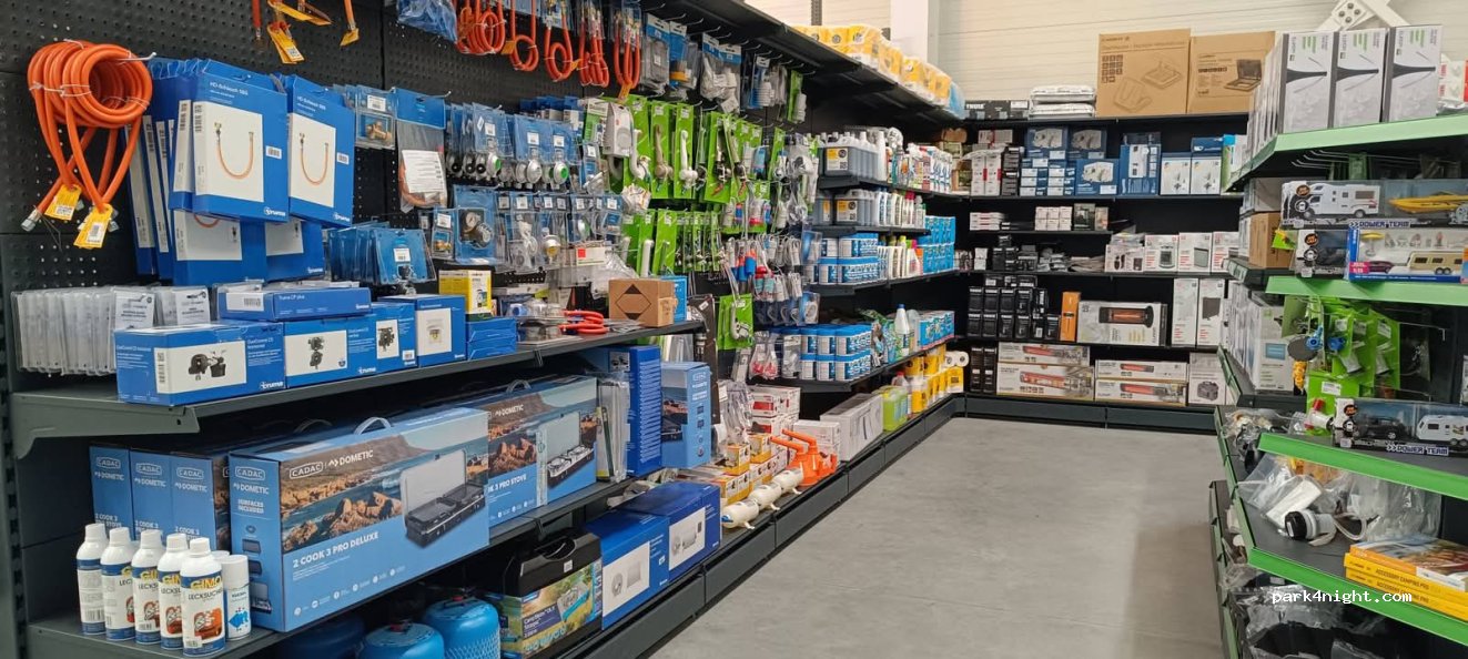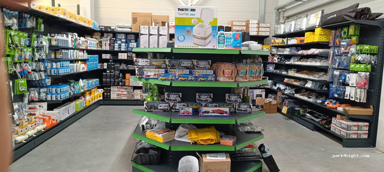 A specialized shop is available on-site, offering a wide range of accessories, spare parts, and consumables for motorhomes and campervans.