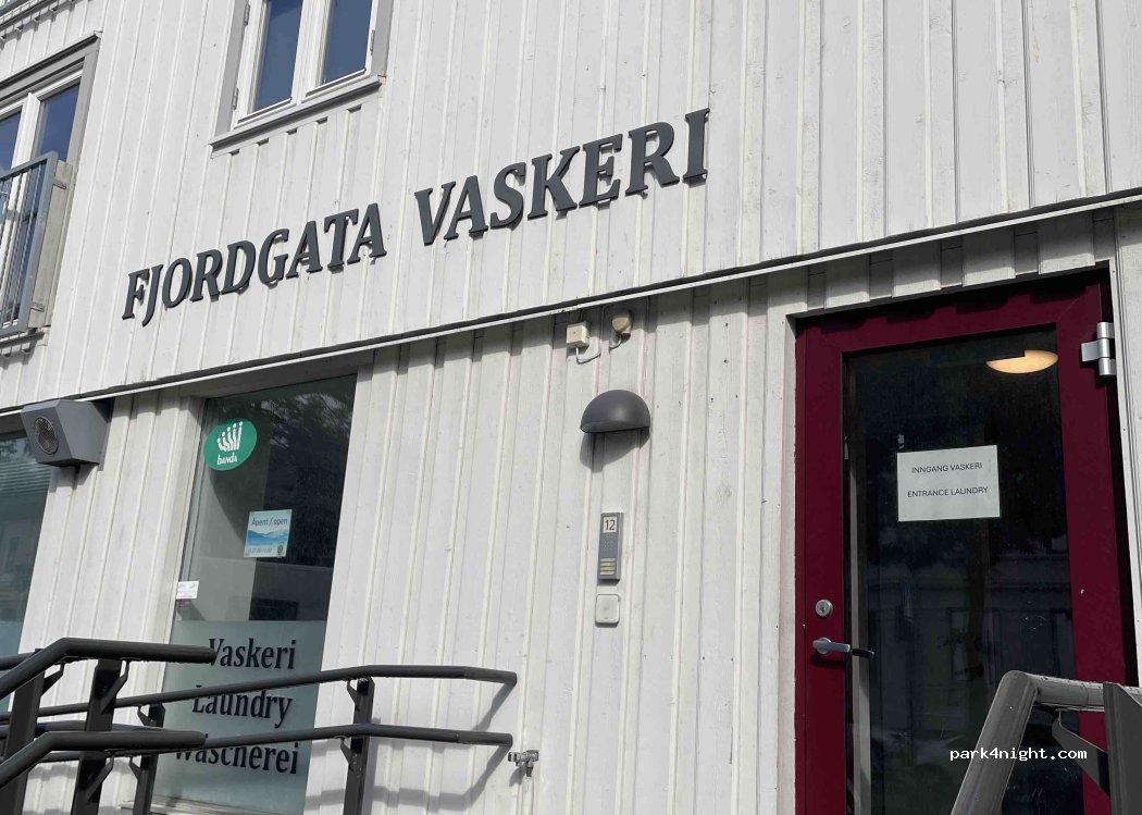 Laundromat, parking available nearby with a small camper or van, between 55 and 70 NOK for a washing machine. 35 to 40 NOK for drying. Detergents are included in the price of the machines. Open 7am / 9pm every day. With access to a sink and drinking water (hot and cold)