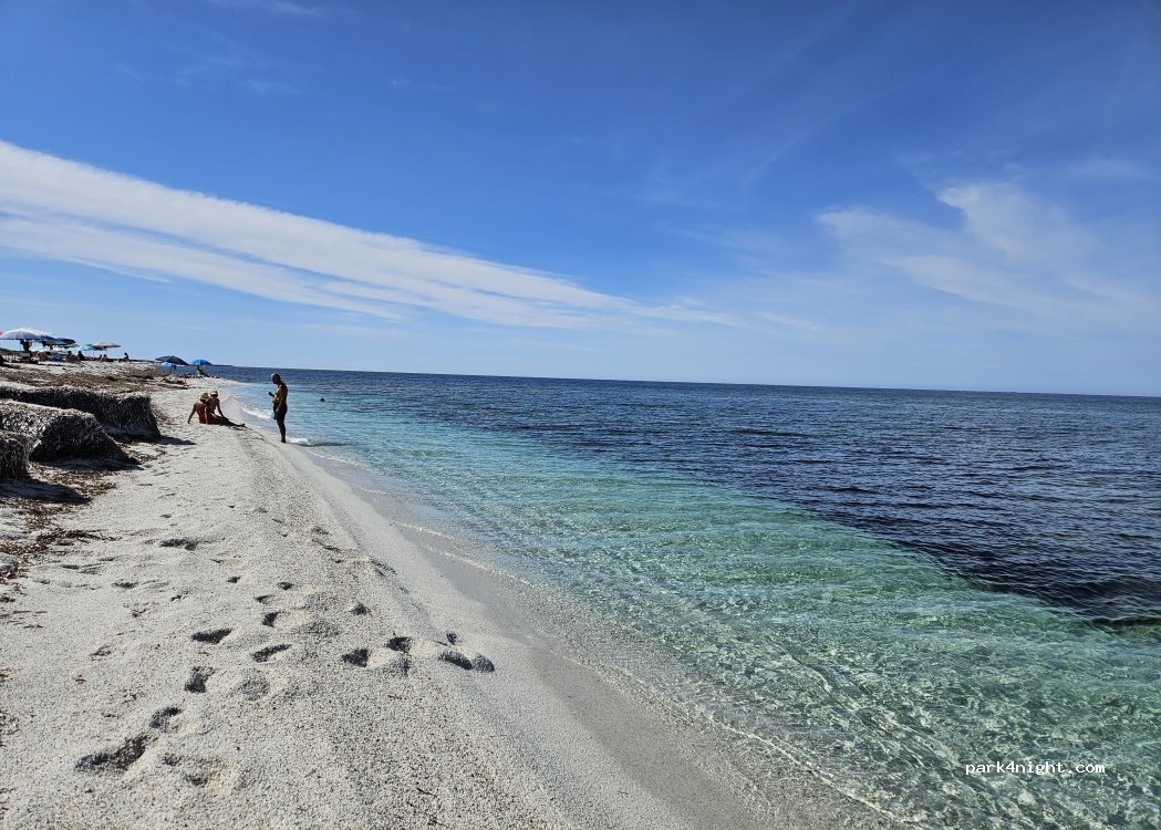 Emplacement idéal pour passer la nuit face à la mer, bercés par le bruit des vagues. Pas eu de moustiques mais il y avait un petit vent. Par contre, humidité dès la tombée de la nuit. Nous avons eu la visite du garde côte le matin qui a bien rappelé '' no camping'' pas de chaises, pas de tables, pas de douche, à l'extérieur. Rangez bien tout. Emplacement gratuit et plat