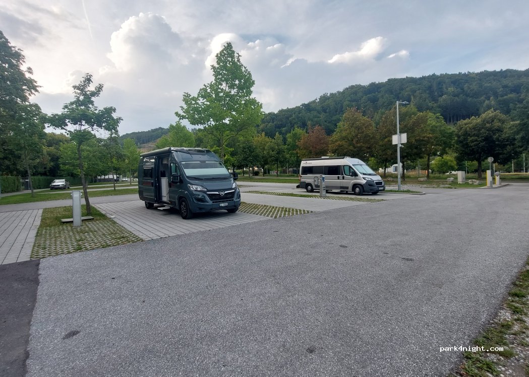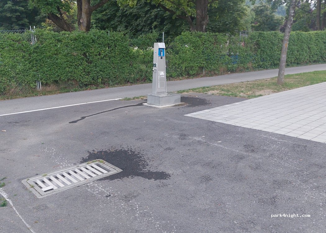 4 plazas dentro del aparcamiento, tienes que entrar por la barrera del fondo y coger ticket. En fin de semana es gratis, luego 50 ctms al día, máximo 2 euros. La electricidad se activa en una máquina, por 1,5 euros tuvimos 14 horas de luz. Al lado hay una zona deportiva con piscinas y toboganes. No tiene sombra ninguna, pero en esta época o para una noche en ruta esa da igual. Noche muy tranquila